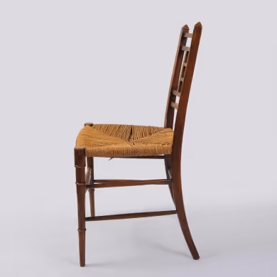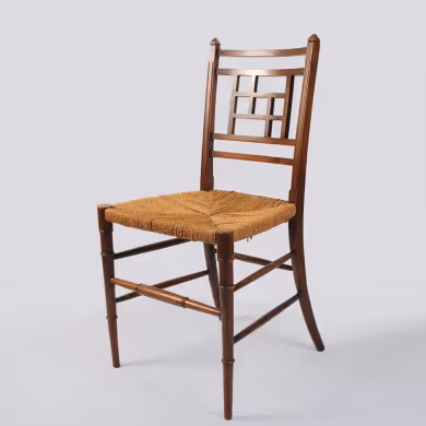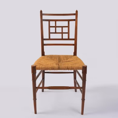 An Aesthetic Movement single wooden chair with fretwork back and original rush seat, stamped 'Shoolbred'