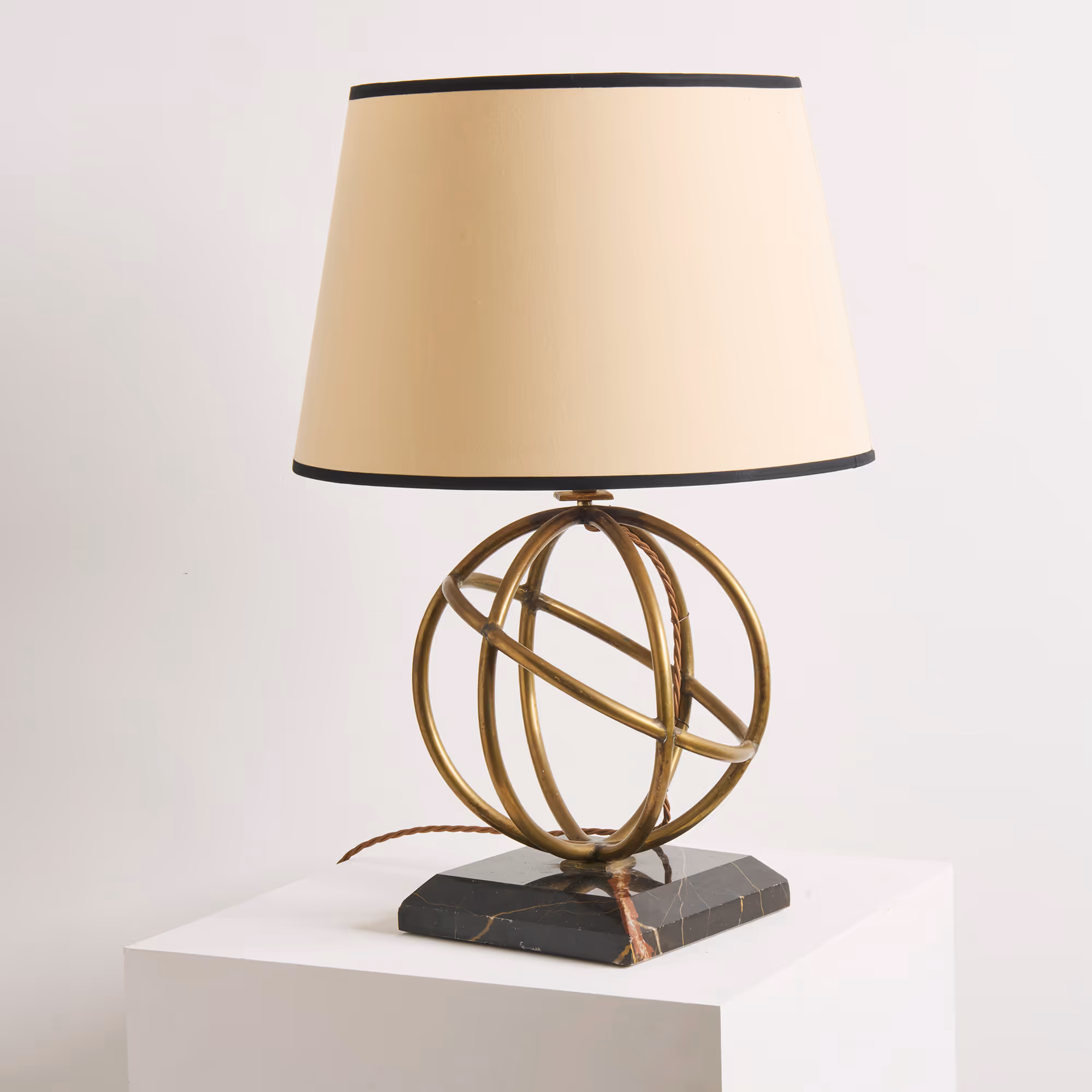 Superb quality table lamp with square marble base and brass orb structure.