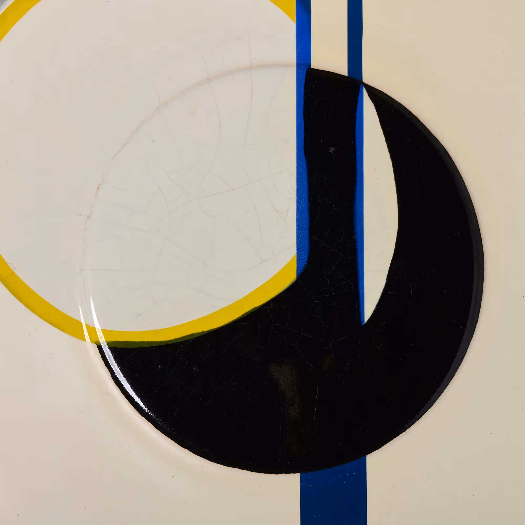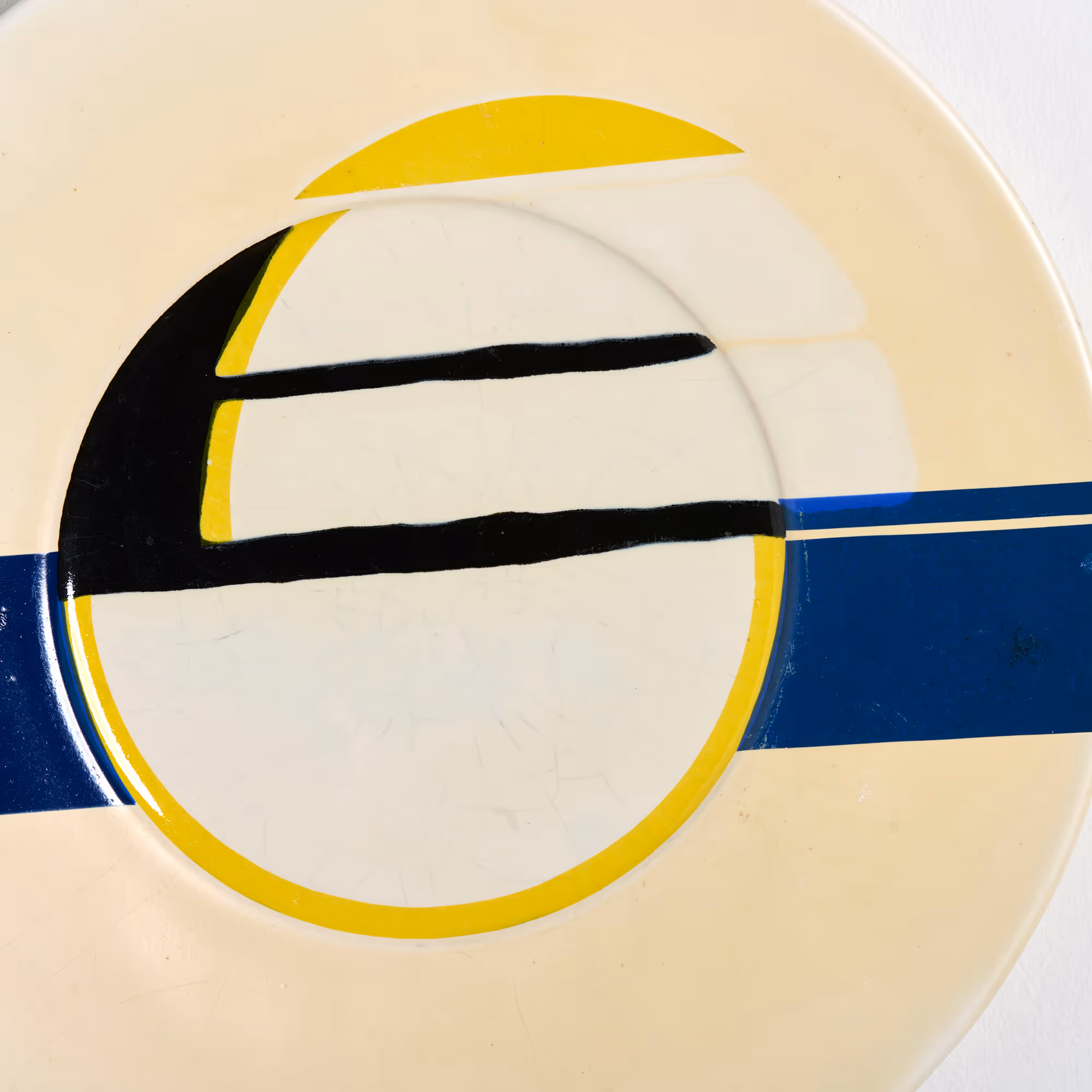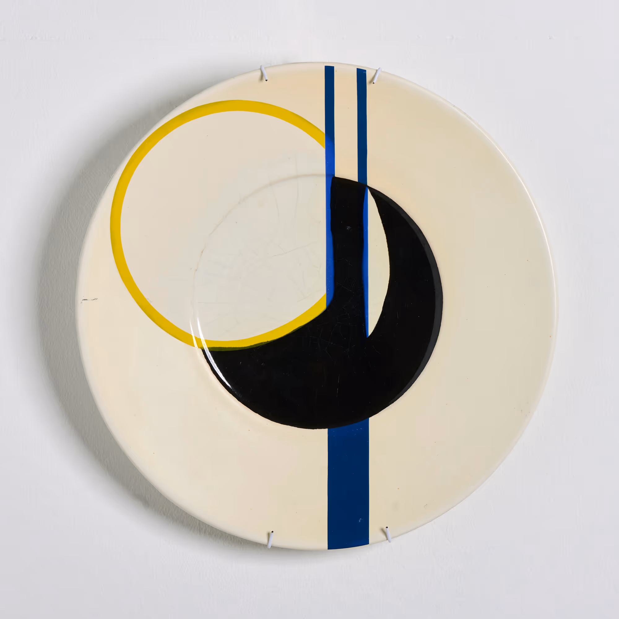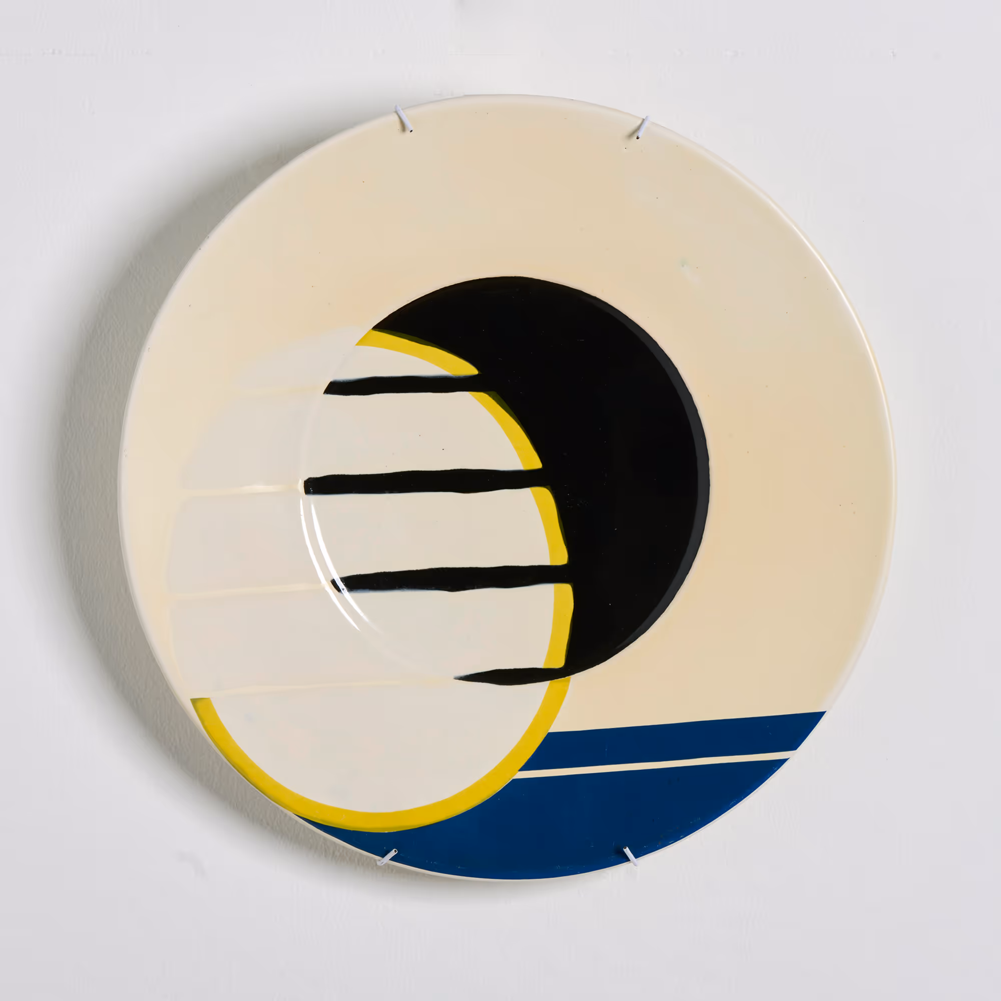 Set of 4x Bauhaus-style chargers. White-glazed ceramic with blue & black geometric designs.